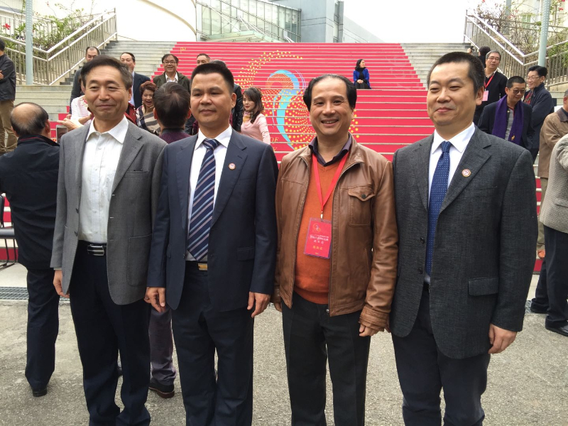 2017年林一明(右二)与现任星海音乐学院党委书记王秀明先生(左二)、副院长陶陌先生(右一)、副院长雷光耀先生(左一)合影于星海音乐学院大学城校区。