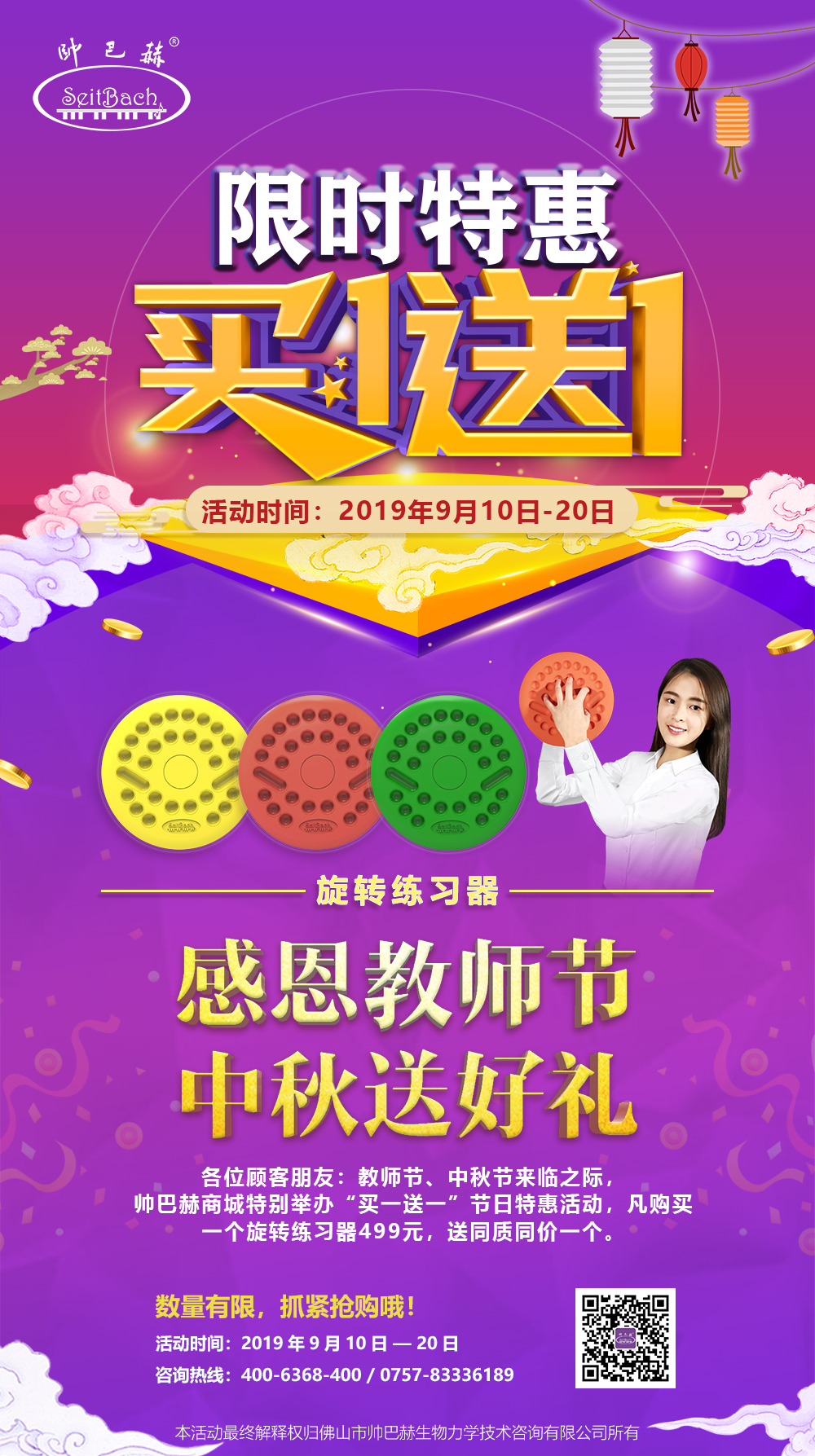 各位顾客朋友:教师节、中秋节来临之际,帅巴赫商城特别举办“买一送一”节日特惠活动,凡购买一个旋转练习器499元,送同质同价一个,数量有限,抓紧抢购哦!