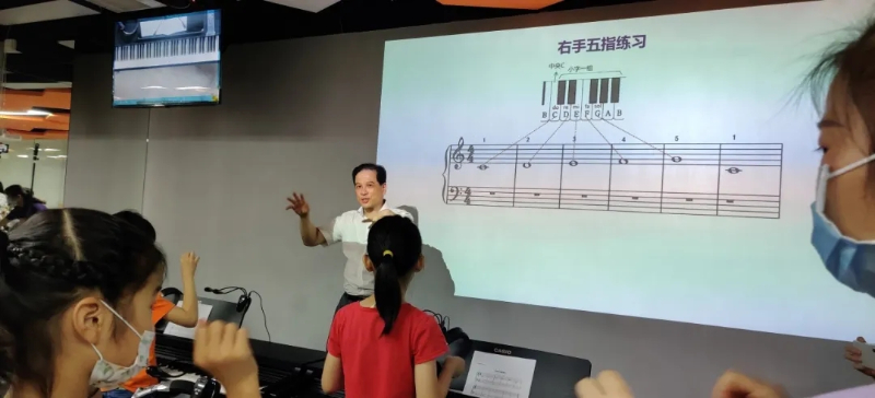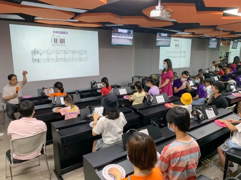 集体课智能钢琴置放于声光电联觉艺术配置的教室中