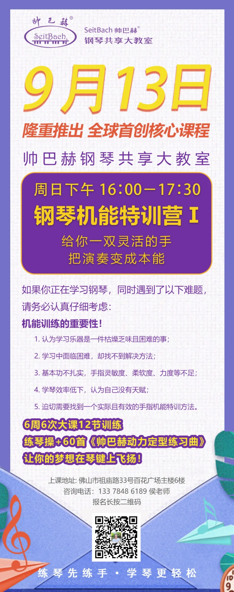 帅巴赫决定,9月13日开设首期“钢琴机能特训营”,