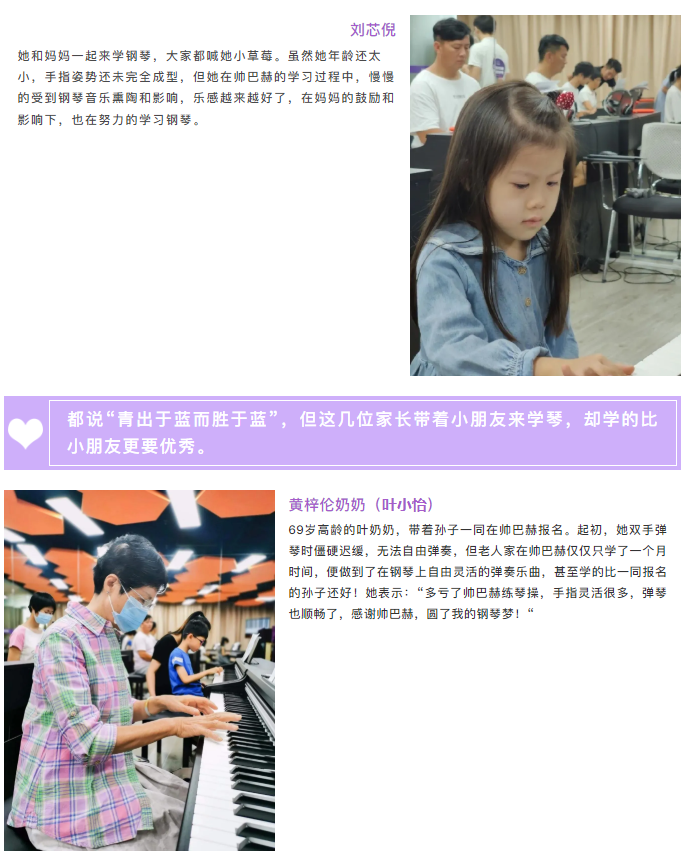 还有许多其他学员,在短短一个月内收获了前所未有的乐趣和感动。他们对钢琴有了新的理解,在曲目的弹奏上也有了很大的进步!在帅巴赫,你会遇上好的学琴方法,这避免了学琴时,许多不必要的弯路。