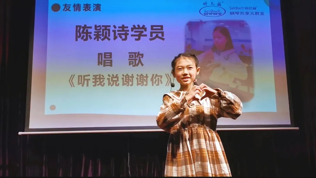 精彩还在继续,听,一阵歌声传来,原来是陈颖诗小朋友给我们带来的《听我说谢谢你》,欢快的节奏让人听得忍不住跟随节奏一起鼓掌!